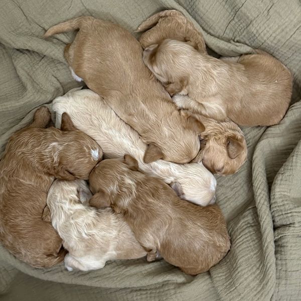 Millie's Cavapoochon puppies are here - 5 adorable boys and 2 lovely girls born on 12/22/25. Ready to go home late February!